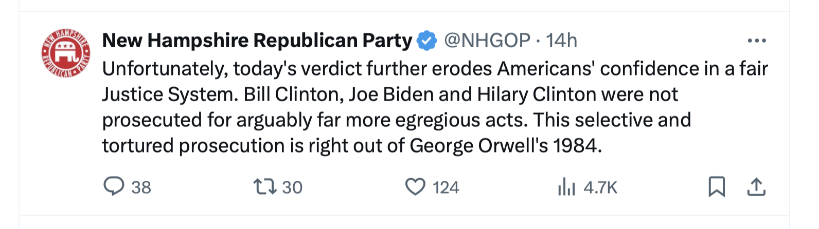 We are witnessing the 2024 election being stolen … the latest and most obvious: the Kafkaesque sham trial of Donald Trump in the kangaroo-courts of New York … and what is the reaction of the NHGOP? To call for Red States to conduct law fare back against the Democrats? To call for New Hampshire Retirement to divest from New York companies? To call for a tourist-boycott of New York? No, no and no.