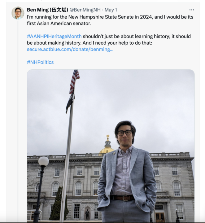 Ben Ming is a State Representative from Hollis who wants a promotion to the State Senate. He says that you should vote for him because he is Asian-American and your vote would help make history.