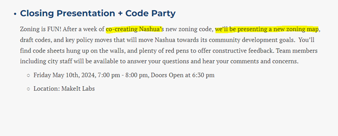 One may wonder how Nashua is going to co-create a new zoning code in collaboration with the public in the span of 6.5 hours over four days. If what is being discussed is actually new, why is there already a new zoning map ready to be presented on Friday?