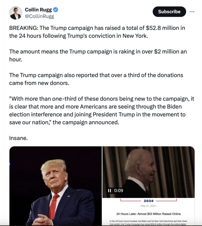 Between the sham conviction and June 1, 10 AM, when I am writing this, the American people … or more accurately the remaining American people who are decent and you can actually call fellow-Americans … have donated over $50 MILLION to Trump: