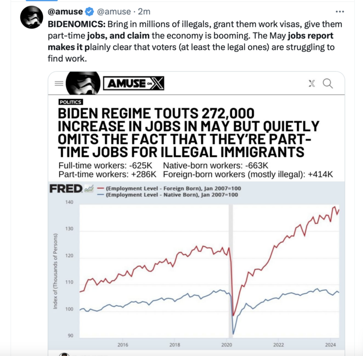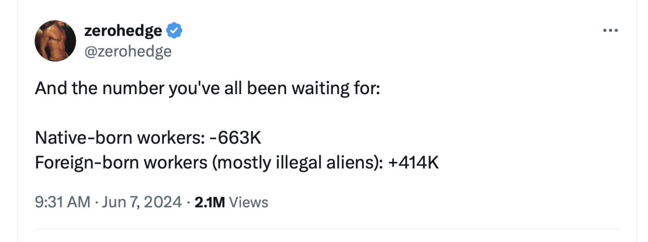 The only jobs created were for foreigners … primarily ILLEGALS. This is how the Great Replacement works, bitter-clingers. But just keep telling yourselves that the Woke-Communists … oh, I’m sorry; I mean “Democrats” … deep down are good people just like us.