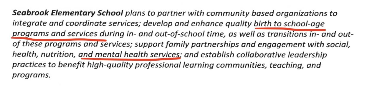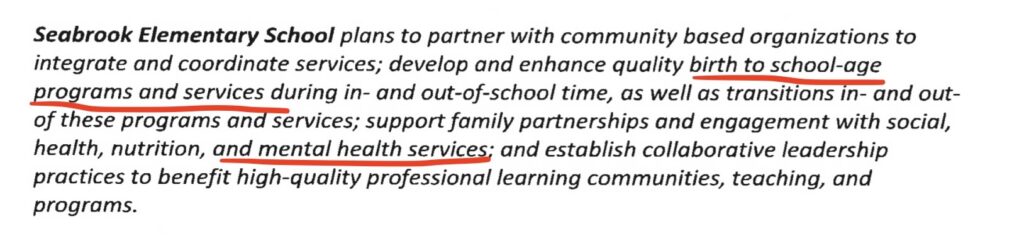 When the Principal of Seabrook resigned recently, he admitted that it was because the board wasn’t supporting the mental health of the students. HUH? I thought this was about preschool. Now the Principal is saying this money is to support the students’ mental health. I’m not surprised, with the Community School model, public schools become mental and medical clinics but with a long list of problems that follow.