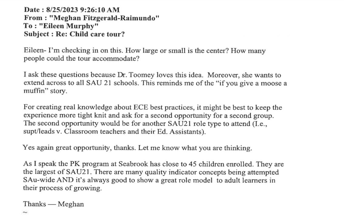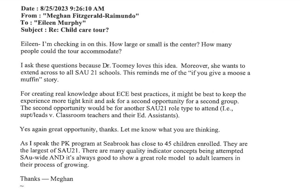 As you can see from these emails, the goal wasn’t just to expand preschool but to begin with infants and expand it to all of the schools in SAU21.