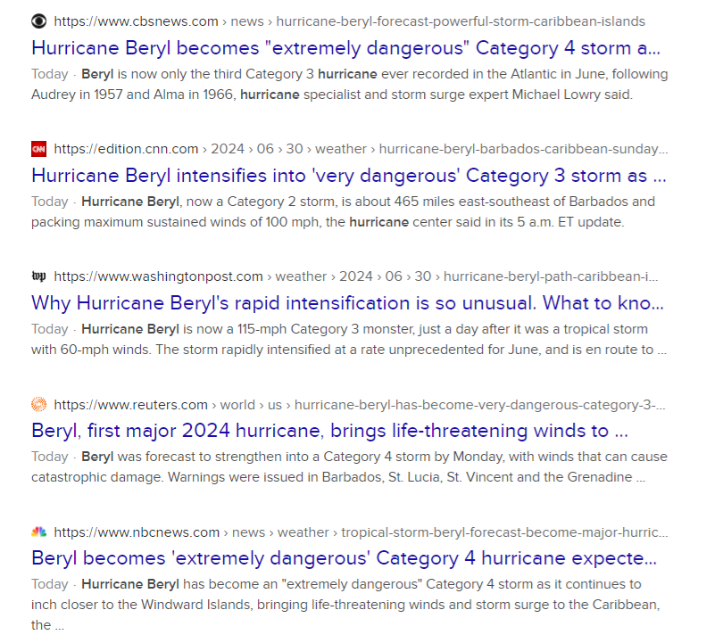 We don’t know if that’s how it will pan out or if Beryl will stick to its current trajectory (maybe reach Cat5?) because the prediction game is precarious a few days out, which—again—begs us to wonder how they can feel so certain about anything ten, twenty, or fifty years along. They can’t. But there is a lot of money and much in the way of political advantage in anything that sustains the hysteria.