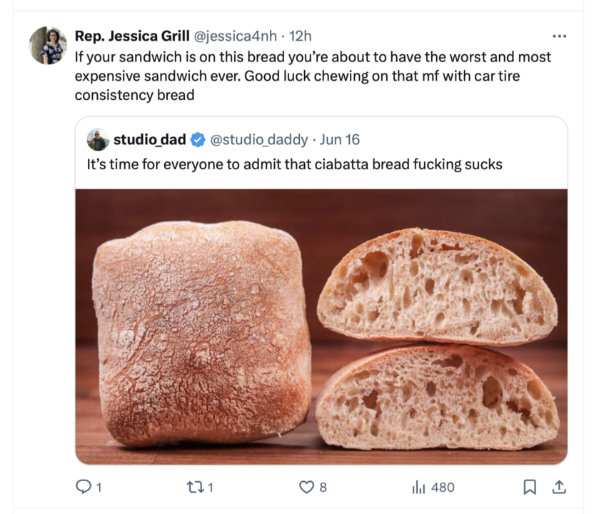 “Representative” Jessica Grill … remember her bitter clingers? The “State Rep” who is either actually a thirteen-year-old who lives on TikTok or who aspires to be a thirteen-year-old who lives on TikTok. The “State Rep” who ideates about having sex with older men on her X.