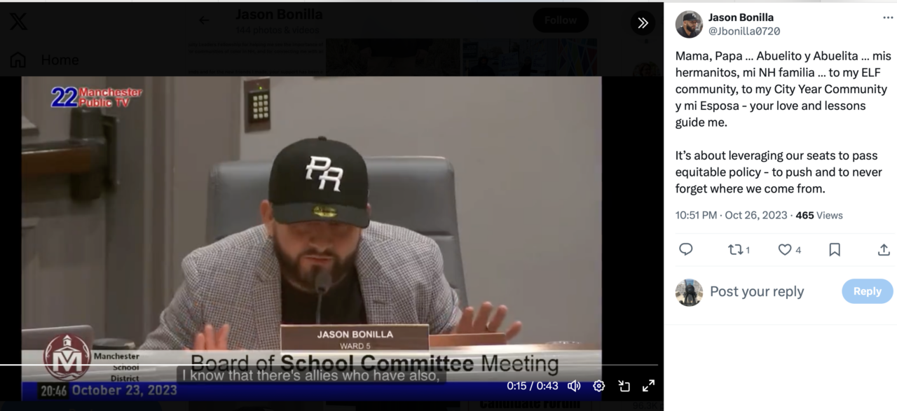 Here is Jason Bonilla … sans cowboy hat, but still wearing a hat … while sitting as a member of the Manchester School Board … talking about how the School Board needs more people who look like him. According to Bonilla, it is not good enough that there are “allies” … a lovely euphemism for whites … on the Board who advocate and vote the same way he does. NO .. his “gente,” the “Latine community” (Latina being the “gender neutral” of Latino/a) MUST be represented by someone like him.