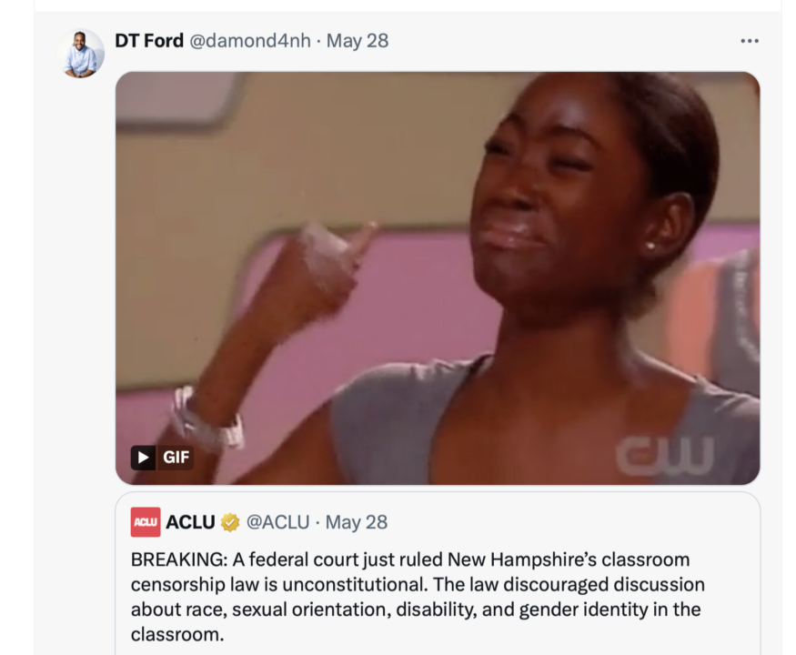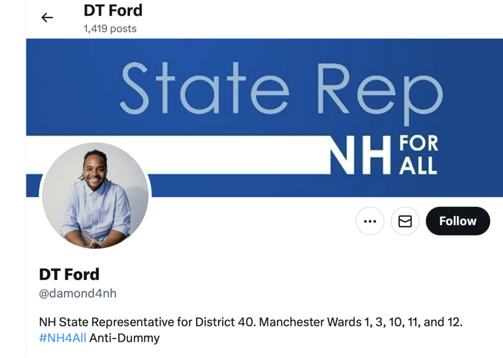 New Hampshire’s Woke-Communists … aka NH-Democrats … are, needless to say, celebrating the death of the anti-discrimination law. Woke-Communism is all about dividing Americans into competing groups, tribes, identities, etc., and pitting them against each other as a means for the Woke-Communists to gain and maintain power. For example, here is Damond Ford, a State Rep supposedly representing part of Manchester, who spends a lot of time shilling for Hamas:
