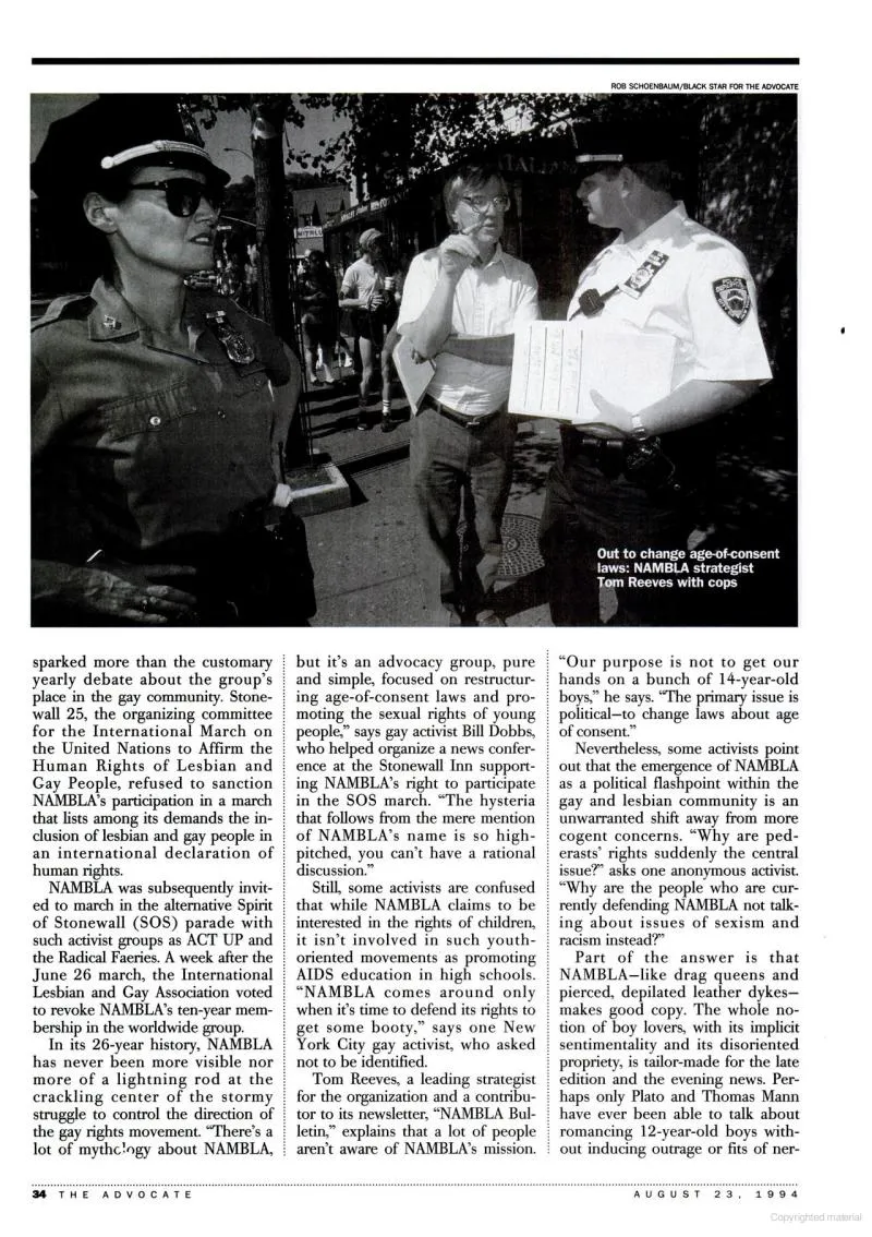 With the restructuring of the B/BC into NAMBLA by Marxist pedophile David Thorstad, it brought with it Thomas Reeves, an anarchist gay activist/organizer, author, professor, and prolific pedophile activist that quickly expanded the group and ingratiated itself into many different previously existing groups.