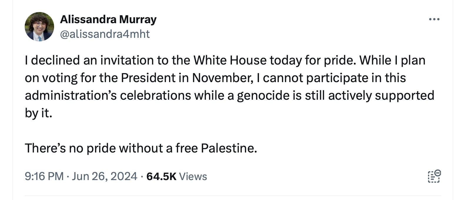 Alissandra Murray … who appears more interested in representing Hamas than the people in Manchester she is supposed to represent … has turned down an invitation to the White House because “a genocide is still actively supported by it,” referring to Gaza. Alissandra, however, apparently has no problem with the genocide in Ukraine … where hundreds of thousands of Ukrainians have died fighting Biden’s proxy-war against Russia.