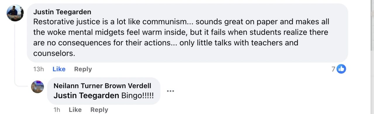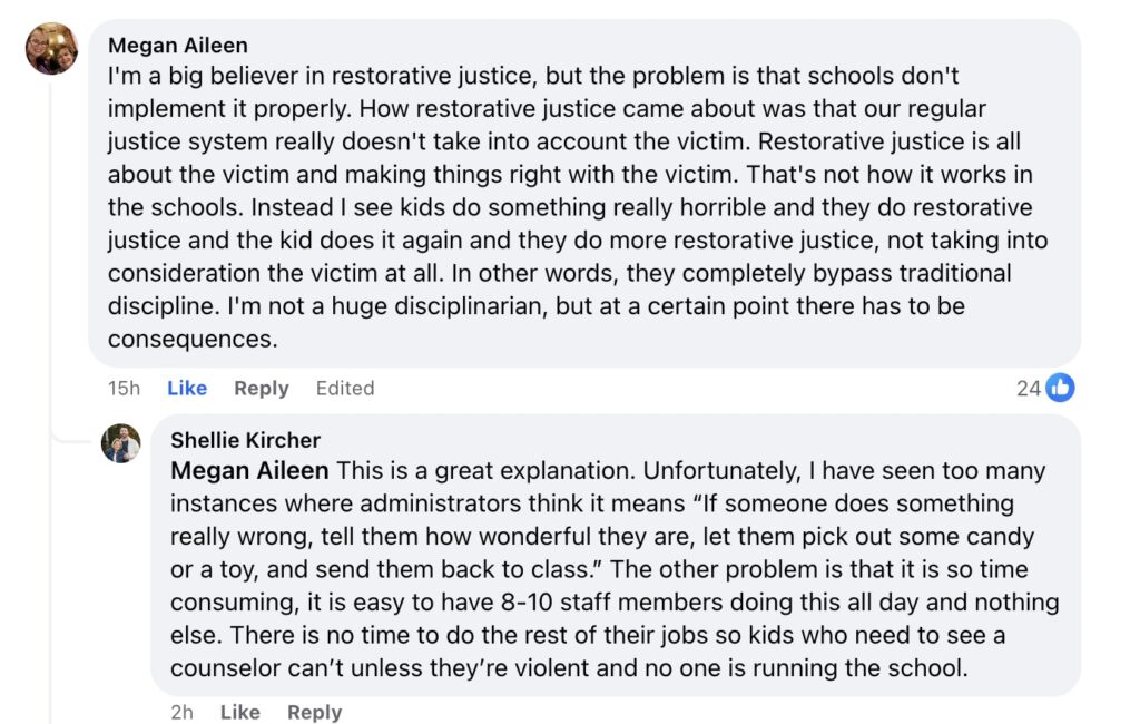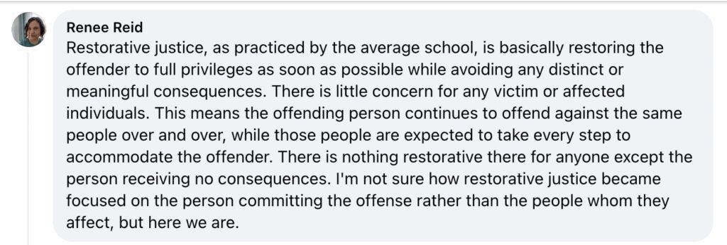 This article from Education Week attempts to explain Restorative Justice in the Classroom. But if you read the comments from educators, you will see that many of them don’t buy it.