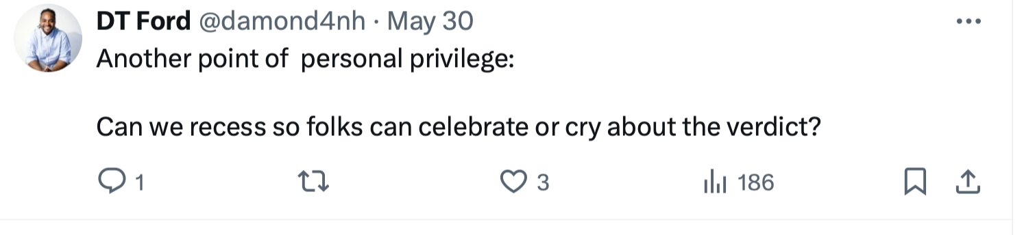 Here’s Damond tweeting about “celebrating” the Soviet-style show-trial of Donald Trump. That’s what Woke-Communists do … celebrate jailing their political opponents. I’m sure that Damond and his fellow Woke-Commies would claim they’re celebrating justice. But, needless to say but I’ll say it anyway, jailing their political opponents is justice to the Woke-Communists.