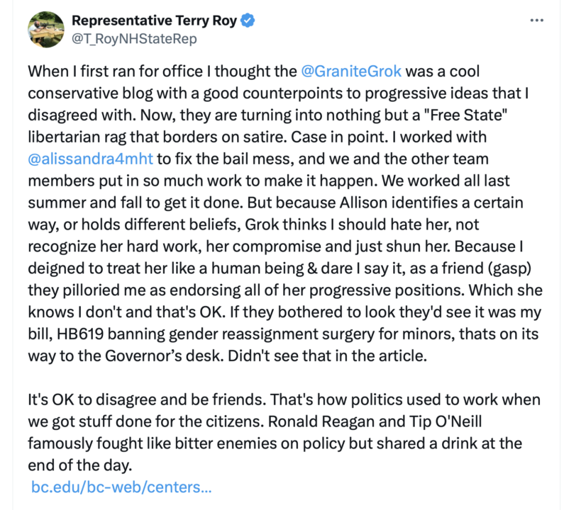Roy also compares the relationship between himself and his “friend” Alissandra Murray to Ronald Reagan and Tip O’Neil. Grandiosity much? What he does NOT do is walk back in the slightest his ENDORSEMENT of Woke-Communist Alissandra Murray.