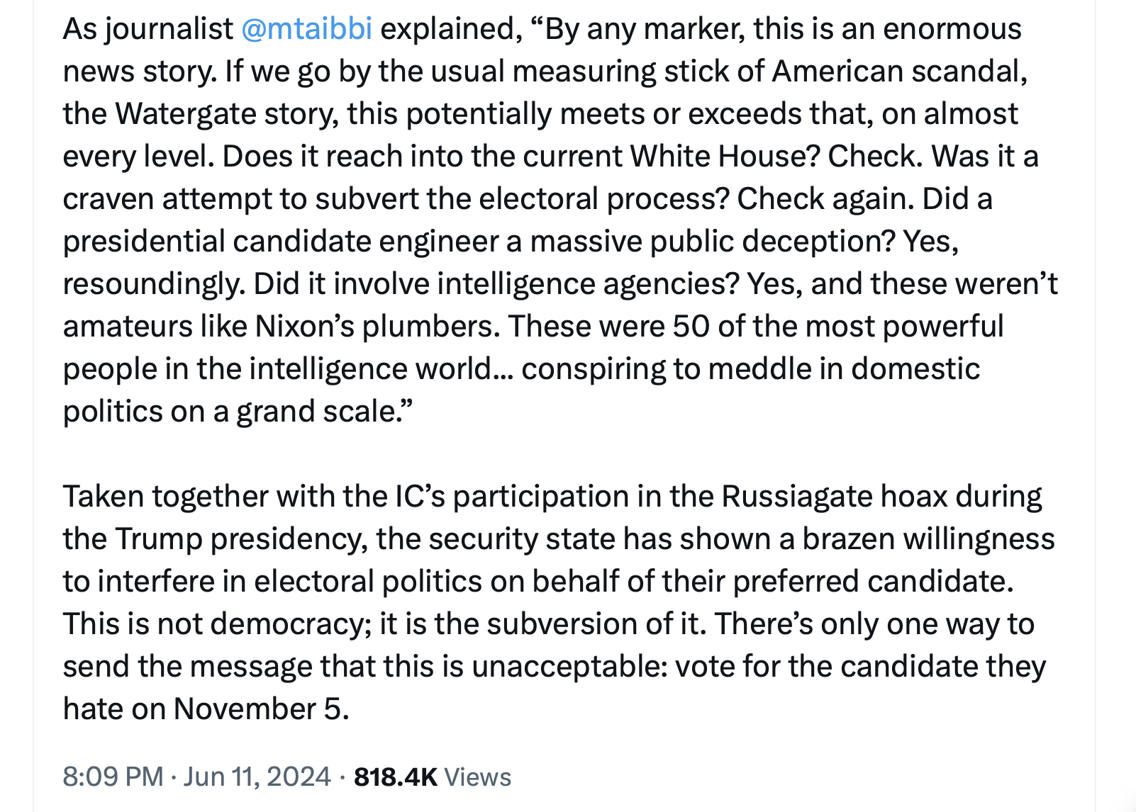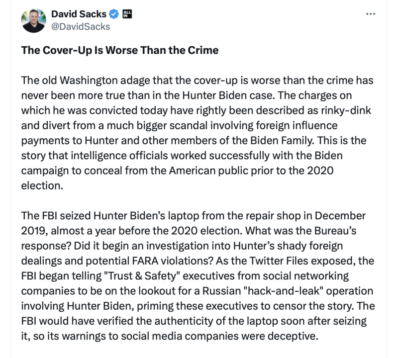 The crimes were displayed and celebrated on Hunter’s laptop … yes, that laptop, the one our “free press” covered up at the behest of our real government, the “intelligence community.” Excellent summation by David Sacks: