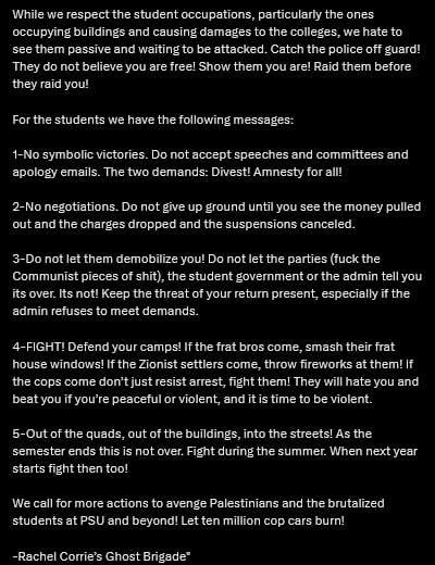It has been clear from the outset that the organizations fomenting disturbances on American college campuses were effectively political fronts for Hamas, a murderous terrorist organization. Now those organizations are beginning to drop even the pretense of operating lawfully. They are now openly calling for revolution and threatening terrorist attacks here on U.S. soil.