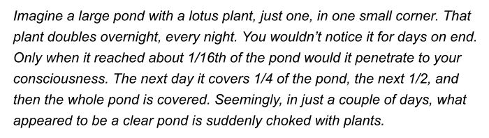 From that above link – and note the year, 2018! – I pulled this screen grab of an analogy I’d read – and cited from memory – in a scifi book about why Neanderthals (hidden among us) didn’t see rising Homo Sapiens as a dire threat until they were overwhelmed “suddenly” by us (no, I don’t recall the name of the book but it was an entertaining read):