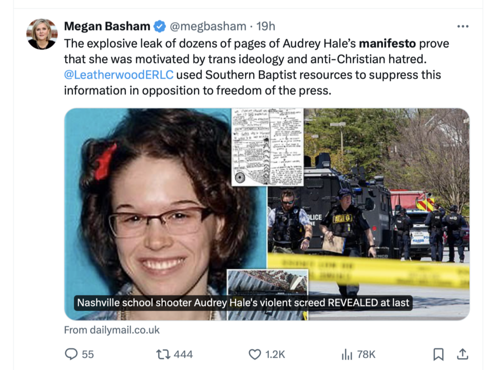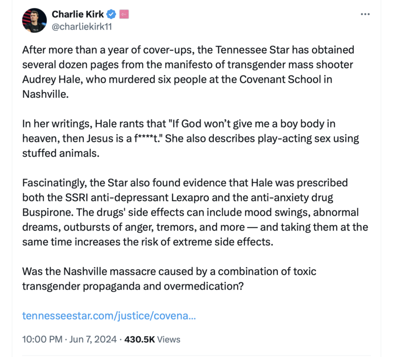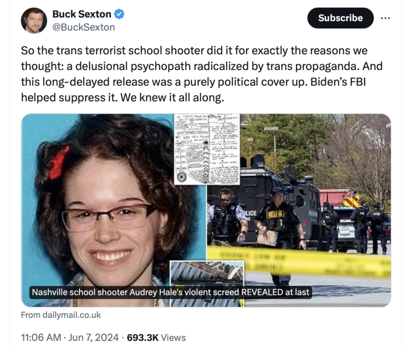 In Alissandra Murray’s alternative universe, she is being relentlessly hunted by Nazis, Neo-Nazis, MAGAs, etc., … and so is her “community.” She’s constantly telling us on her X (twitter) how courageous she is for carrying on in the face of all this. One thing you won’t see on her X, however, is the Nashville “manifesto” … obviously because it doesn’t mesh with the alternative universe that Murray chooses to live in: