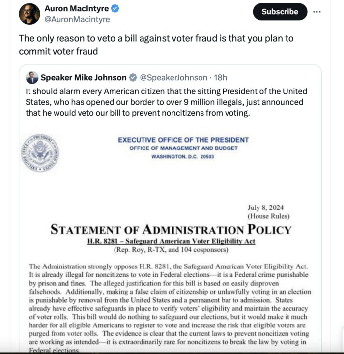 How many ILLEGALS will be voting in 2024? I cannot give you an exact number, but I’m certain that we are talking about MILLIONS. Where’s the proof … where’s the proof … where’s the proof … bleat the rank-and-file Commy-bots, the useful idiots like Mikey Graham … the corporate media, etc., etc., etc. Well … if you weren’t planning on having ILLEGALS vote, why would you be threatening to veto a bill that would make it harder for ILLEGALS to vote?