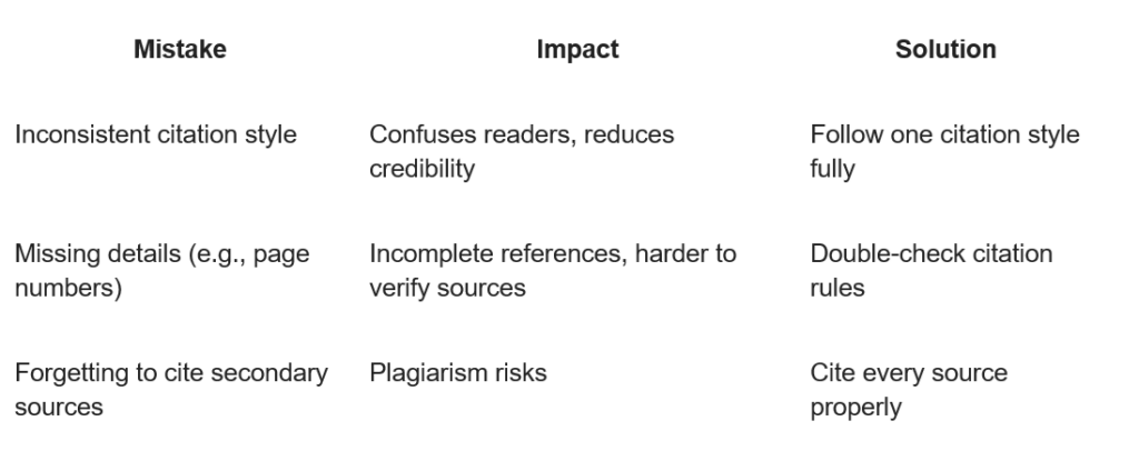 Inconsistent citation styles are a prime example. If you have APA, MLA or Chicago style, stick to it throughout the entire paper. Another error is not including page numbers or any other information required by your style. Make sure you know the rules and adhere to them.