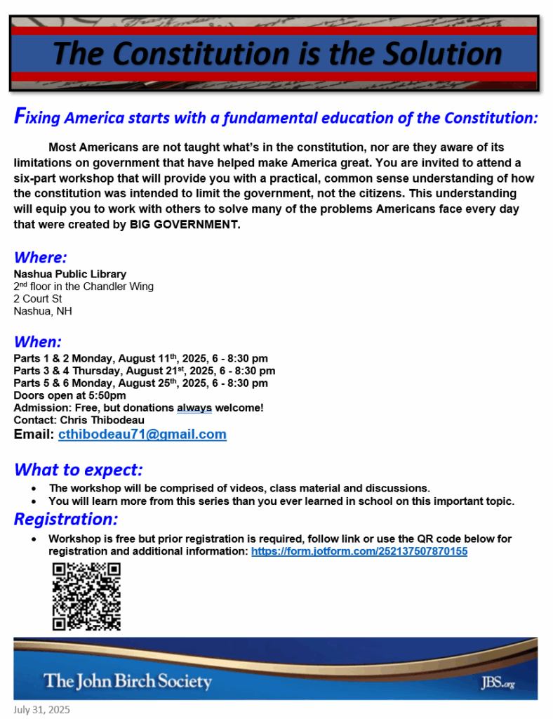 The other library event, which is open to women and men, is a 3-part workshop called The Constitution is the Solution, which starts next Monday, August 11. Please RSVP to Ward 6 Alderman and John Birch Society Chapter Chair Chris Thibodeau, so enough copies of participant packets can be printed and the activity room can be set up accordingly. I took this workshop myself the last time it was offered, and it was definitely time well spent. Though it wasn’t this particular workshop, you-know-who was seen at another JBS event at the library, and someone took a picture just for evidence because sometimes we witness things that are just too darn strange to believe. Hey, maybe someone at the women’s event can remind her about this one!
