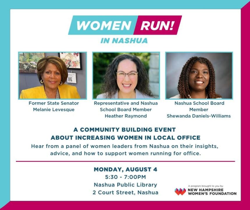 Some readers are already familiar with my most recent article, “The Future of Nashua’s Library,” which highlights a public comment opportunity on August 6. Additionally, there are two other events worth noting: the first is on Monday night, August 4. It’s called “Women Run” and features three public servant panelists.