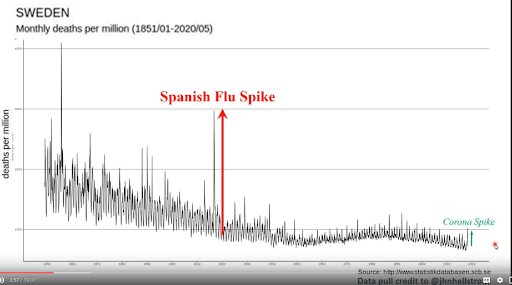 We can see that ten years in the last thirty (fully one third) was roughly equivalent to 2020. And three other years during that period exceed 2020 — by up to 30%. And, 2020 is dwarfed by the Spanish Flu, a real once-in-a-lifetime event. From this data, it is impossible to claim that any disaster struck Sweden in 2020, nevermind “unprecedented”. Can we really argue that Sweden was worse off in 2020 than in 1994, when roughly 30% more died? And does anyone remember 1994 as a disaster for Sweden?