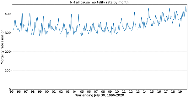 Turning to the numbers for NH, the lack of an “emergency” is stark. The State’s NH Vital Records website provides current mortality data from January 2005 to present. With population data from Macrotrends, we can graph the monthly mortality rate per capita for NH.