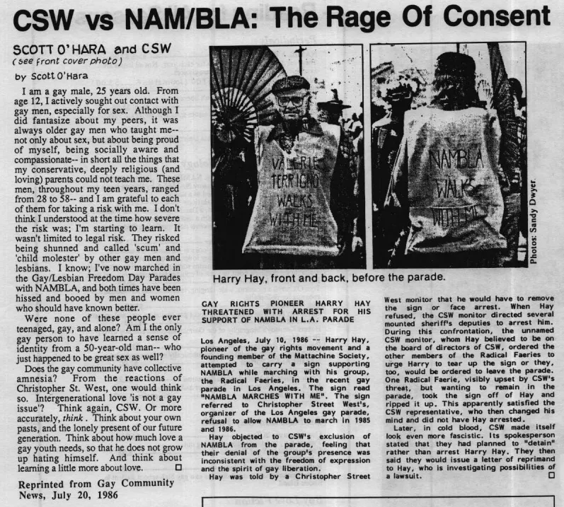 Hay was an ardent supporter of the North American Man/Boy Love Association (NAMBLA), a gay organization that advocates for pedophilia, and in a 1983 article, titled “A Quest for Knowledge,” that Hay wrote for NAMBLA, he makes the parallel of the word “faeries” to his organization that he founded, the Radical Faeries: