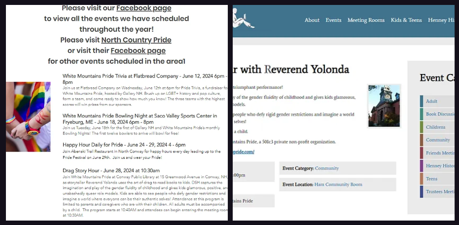The event was organized by the infamous White Mountains Pride, which organizes Pride events throughout parts of New England, though primarily in NH. This year, the Conway Public Library decided to re-invite this drag performer with a checkered past. So, I decided to dig back into Reverend Yolanda’s life and see what else I could find.