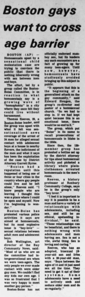 B/BC members explicitly reference what occurred in Boise when they named the group. Employing Boise was more than a rhetorical move, however. Marxist, John Gerassi, author of The Boys of Boise, was a featured speaker at B/BC fundraising and public awareness events. Moreover, his analysis of the “witch-hunt” tactics employed by Boise’s business and political establishment would all be echoed in the writings of B/BC and NAMBLA members.