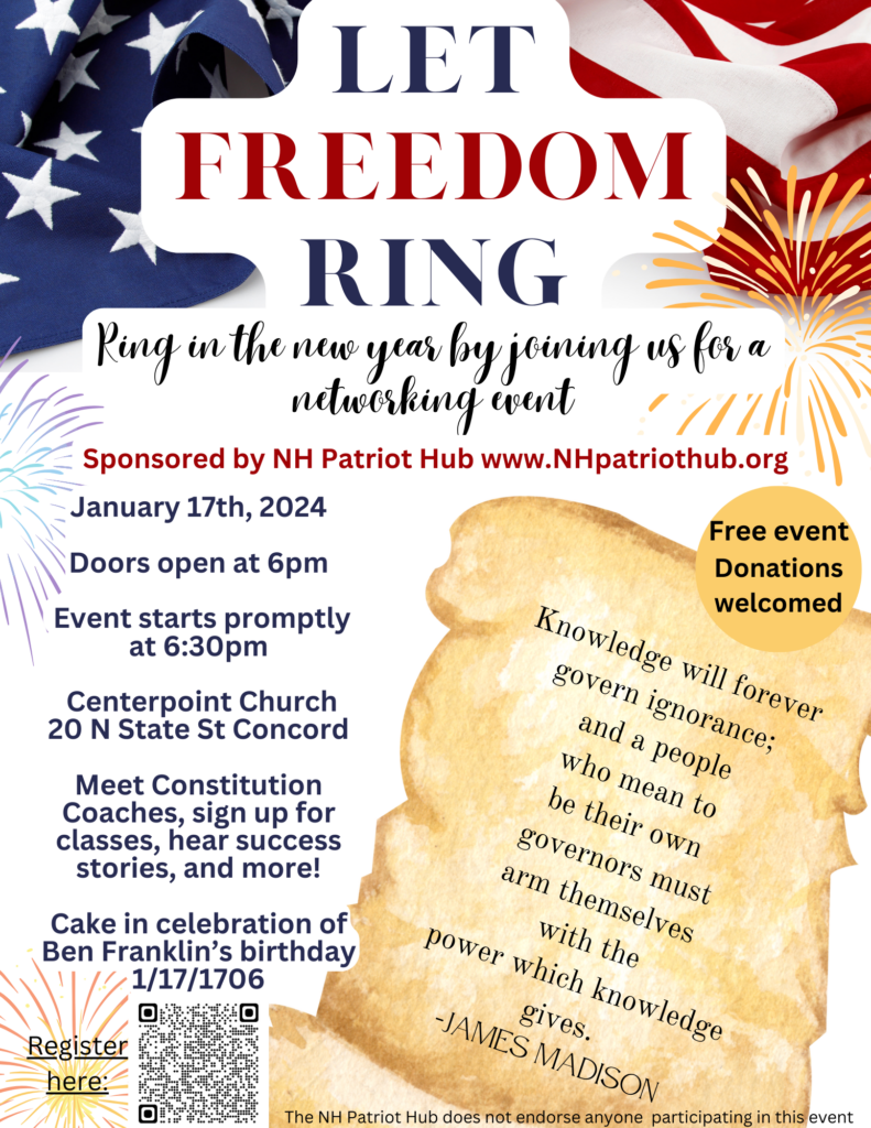 The NH Patriot Hub is sponsoring a large networking event centered around connecting Constitution coaches/instructors with citizens who are interested in learning more about their rights and our great US and NH Constitutions.