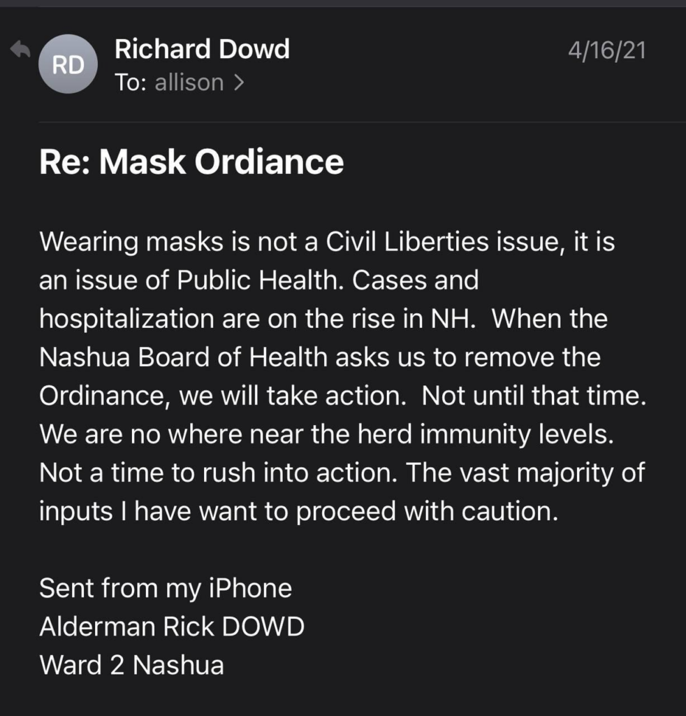 And then there’s how city hall has handled covid, which has been in a manner that’s repugnant to Granite State values. Attorney Dan Hynes, now a Bedford representative, pointed out in his 2020 Grok piece that NH was not a home rule state when he was running for county attorney. Here is an example of Dowd’s “covidiocy” in addition to him having voted for Mask Madness 1.0 and 2.0. He was also seen on Channel 9 suggesting that business owners act in a law enforcement capacity, whether or not they supported such tyranny.