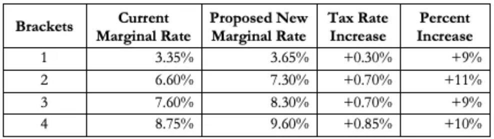Sections 24 -27 lay it out clear that should S.56 become law, income tax rates will increase by bracket from 3.65% to 3.8% (a 9 percent increase) on those earning $42,150 or less, from 6.6% to 7.3% (an 11 percent increase) on those earning between $42,151 and $102,200, from 7.6% to 8.3% (a nine percent increase) on those earning between $102,201 and $213,150, and from 8.75% to 9.6% (a 10 percent increase) on those earning more than that.