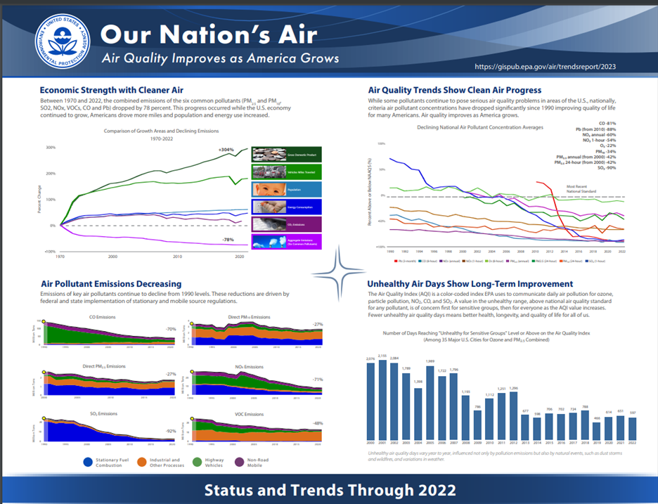 Between 1970 and 2022, the combined emissions of the six common pollutants (PM2.5 and PM10, SO2, NOx, VOCs, CO and Pb) dropped by 78 percent. This progress occurred while U.S. economic indicators remain strong.” (U.S. Environmental Protection Agency, “Our Nation’s Air Quality: Trends through 2022“)