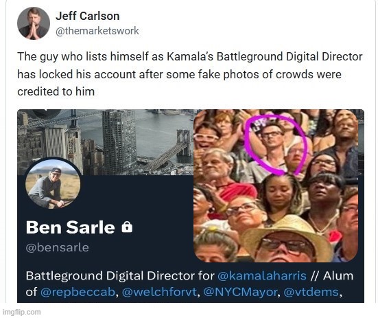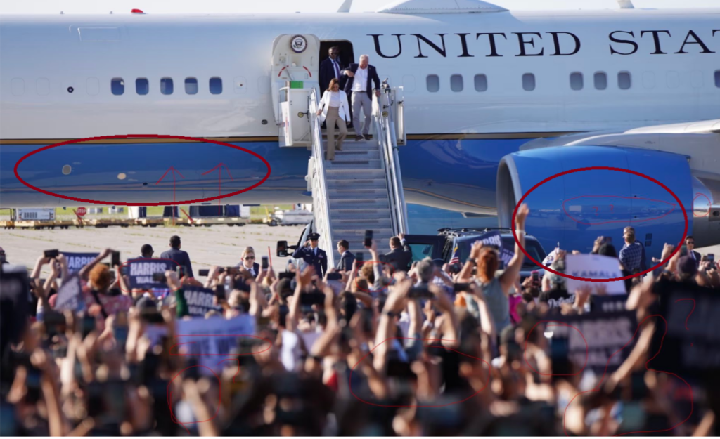 I hear rumors that there are more examples of this; faking crowds for Kamala, But this one was easy and obvious. The picture shows throngs of cheering fans greeting nominee Kamal and VP in training Tim Walz as they exit Air Force Two. It is a bright day, a shining plane, but the reflection on the engine metal shows one or two people, most likely the Secret Service, and none of the “people” someone added in the foreground.