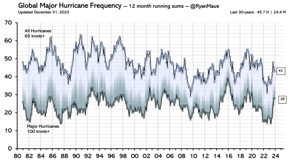 In other words, the evidence suggests that human-caused climate change, as defined by CNN and company, is reducing the frequency and severity of storms landing in Louisiana—but not just there.