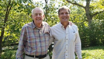Wendell Berry, left, standing with the author at his Kentucky farm