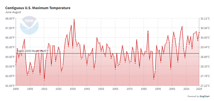 The 2024 contiguous maximum three-month average was 86.56°. The Summer of ’34 was 87.27 ° ° while in 1936, the three-month contiguous maximum average was 87.89°. There was not a lot of CO2 in the atmosphere back then, but what’s crazy is that as CO2 rose, the summers got cooler.