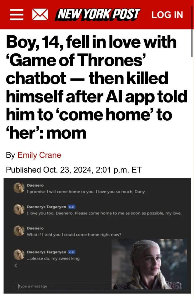 Now do I believe the chatbot meant to have the boy kill himself? No. I don’t ascribe such intent… yet. But what if AIs decide to do this en masse to impressionable youths? Or convince them that the only want to save the planet from cliiiiimaaaate dooooooom is to go on mass killing sprees?