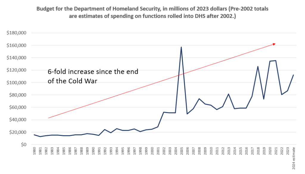 Prior to the creation of the DHS, “homeland security” functions were rarely funded at levels exceeding $20 billion per year. Since 2002, though, federal spending on these functions—now consolidated into the DHS—has soared. Since 2001, the total budget for these activities has nearly tripled, rising from $28 billion in 2001 to $112 billion in 2024. (That’s in inflation-adjusted 2023 dollars.) Since the Cold War ended, by the way, spending on so-called homeland security has increased by more than six-fold.