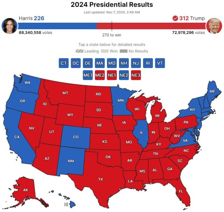 Steve has been doing yeoman’s work on election reporting; his latest, the “almost done” report, Harris at 226 and Trump at 292 Electoral College votes (scheduled for this morning). Well, last night, Arizona and Nevada were finally called by Decision Desk HQ, so we have the final blowout result that I (staying up until 3 am Wednesday morning) was expecting would happen:
