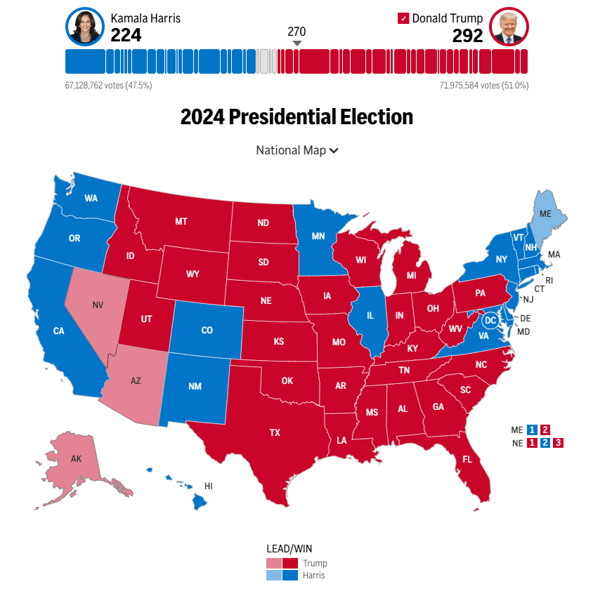 If the leads hold, Trump will finish with 312 Electoral votes.