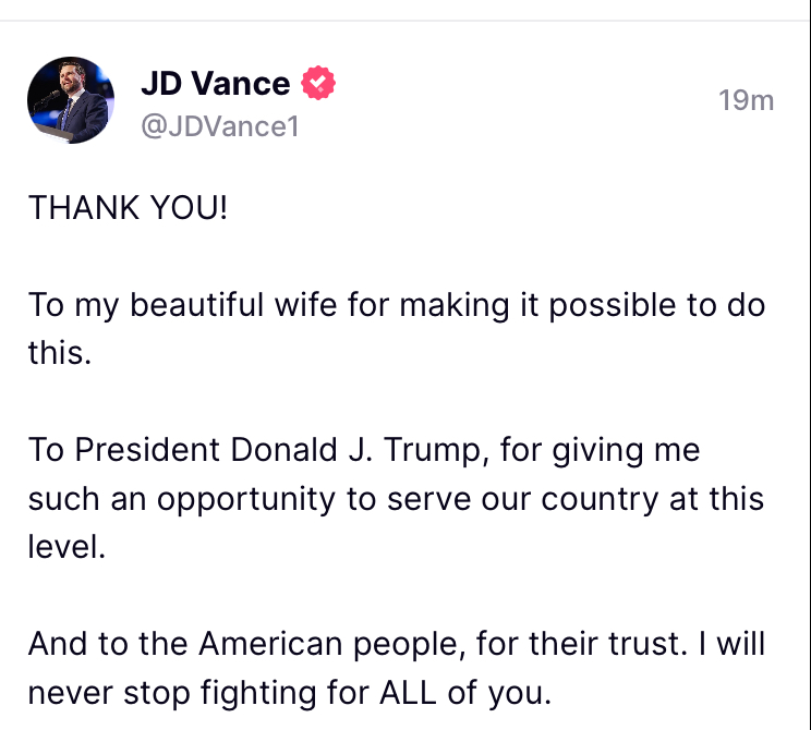 JD Vance may have been under the radar as a Senator from Ohio, but he was front and center when he decimated Tim Walz in their debate. He is brilliant, has a complete grasp of the issues, is a great communicator, can think well on the fly, and is unflappable. Vance comes to the job with the perfect attitude. He knows his job is to do whatever President Trump needs, but he showed throughout the campaign that he not only says the right thing but is committed to every aspect of Trump’s agenda. They are on the same page from Day One. While typing this piece, Vance posted this perfect note on Truth Social.