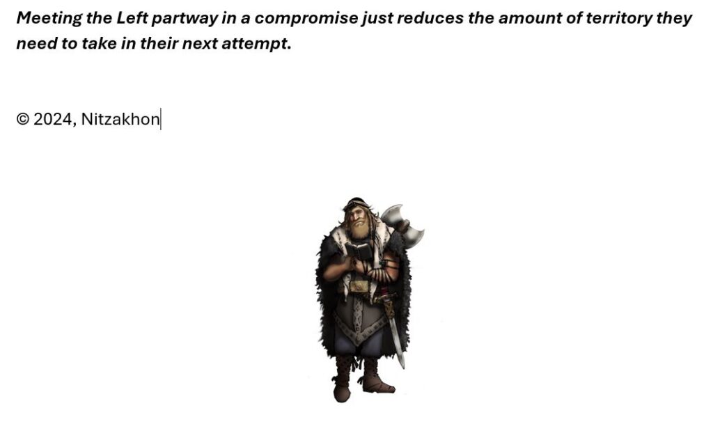 12. Beware, beware, the urge to meet the Left halfway. I spun off a Nitzakhon Quotable about that. Go back to the top – they’re missionaries. They will not stop, ever. Don’t give an inch. And work to set things up that if… when… they regain power, it’ll be hard for them to just reverse.