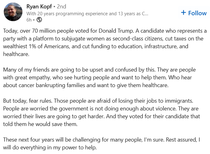 This guy on LinkedIn cannot grasp that people disagree with him – you don’t have to like or agree with Trump, but to not even ask the question “Why do people like him”? seems awfully incurious: