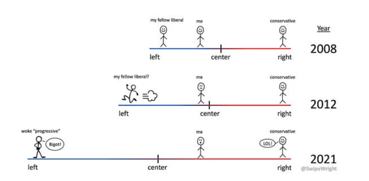 I was out for a walk last Thursday when Elon Musk tweeted a political cartoon that I created in August 2021. It received hundreds of thousands of retweets and more than 1.5 million likes. The stick figure in the middle depicts me, a center-left liberal in 2008, and how the ground had shifted under my feet by 2012 and 2021.