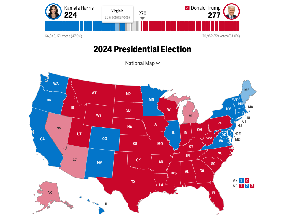 When I went to bed last night, Kamala Harris needed 60 electoral votes, and Donald Trump needed 40 (to get to 270). PA, GA, MI, WI, ME, MN, AZ, NH, AK, and NV had not been called.