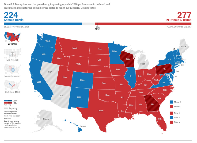 Trump “officially” has 277 electoral votes. He won Georgia and Pennsylvania and is leading in Nevada, Arizona, Wisconsin, Michigan, and Alaska. He needs one of those. Over but not over? What about the chaos of 2020? Unseen so far.