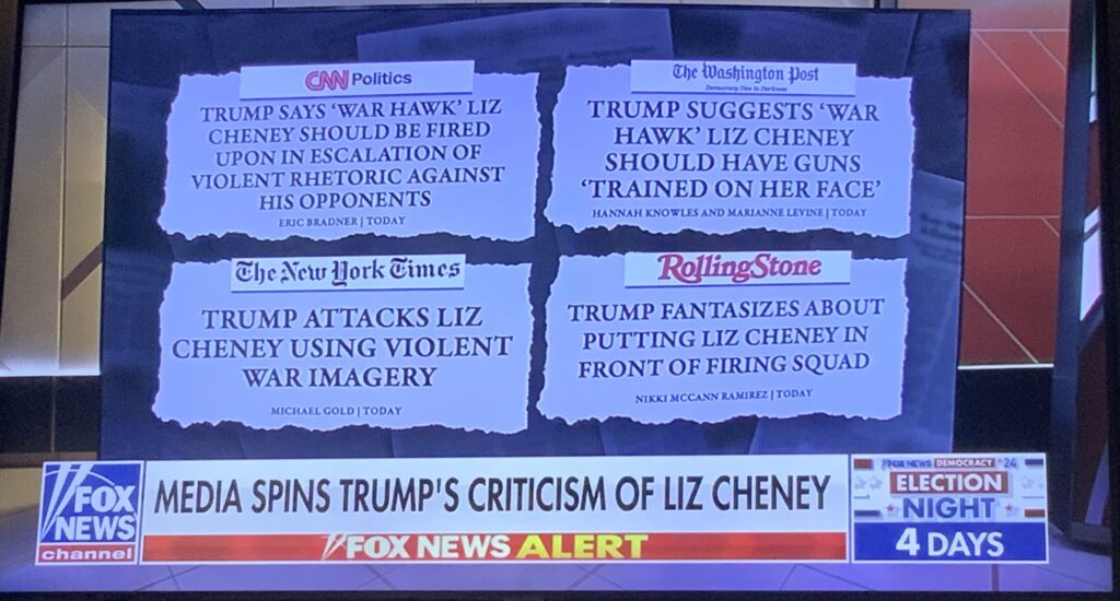 “Cheney slams Trump after he calls for her to be shot,” was the chyron streaming across the CNN screen in front of Jim Acosta doing his Chuck Schumer impersonation with his glasses on the tip of his nose. (Bifocals, guys….come on, they have been around for years.) This image was seen on thousands of screens in hundreds of airports, as CNN pays to have their signal broadcast exclusively in American airports. Millions of travelers saw this bastardized statement without hearing the context behind the blatantly created narrative. CNN pays billions of dollars a year and, in some cases, even supplies the TVs and infrastructure to be the exclusive network on airport media. If these dollars were not spent on exposure, they may have none, which may be what they deserve.