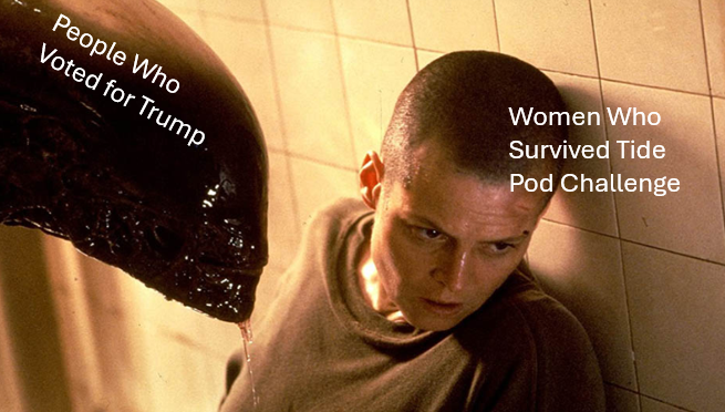 The people have failed them, and democracy has failed them. In reality, the Democrats failed them. Hey, let’s all look like Ripley from Aliens 3. That’ll send a message, and what better way to fight a monster? It does! You are too busy to nit another pussyhat or can’t agree on the color [Pink is so triggering].