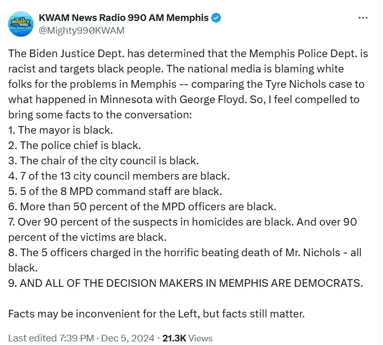 It sounds like an out-of-control frat house. And I’m not saying I disagree with the DOJ report in general, but KWAM News Radio Memphis (The Mighty 990) had some facts pertinent to the debate it shared on X. Trigger warning: the staff page is littered with a bunch of white people and a Dalmatian (primarily white).